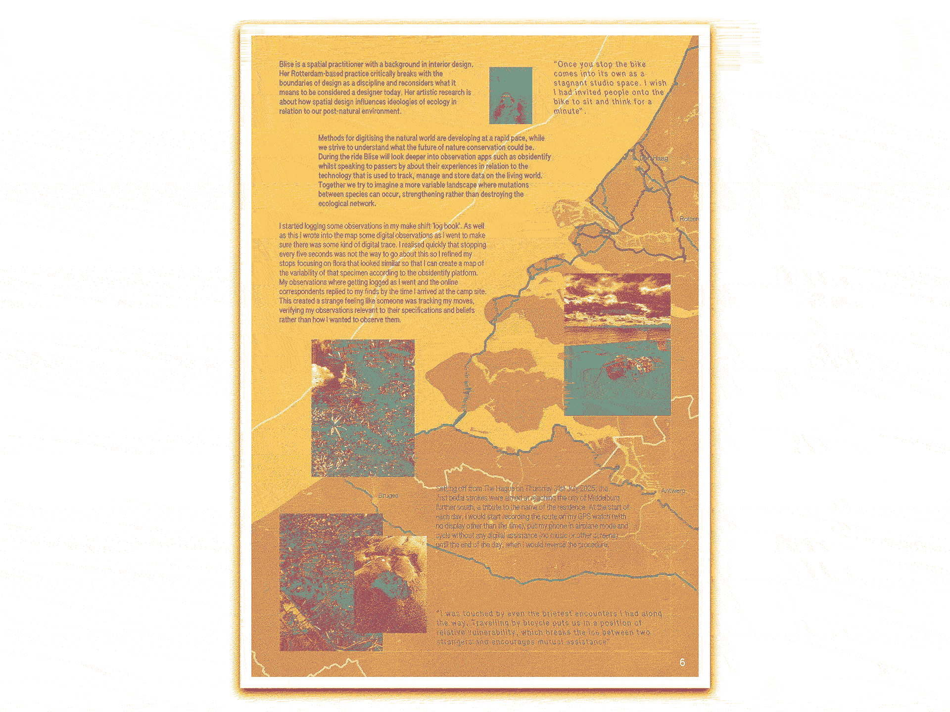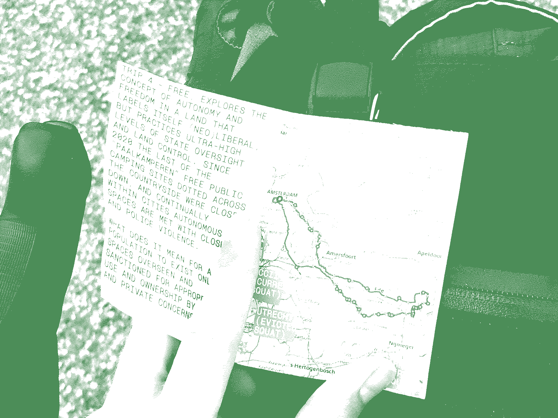 A printed publication collates the groups' questions about our surrounding systems and spaces, in a continuously moving shared community of practice in perceiving, protesting, and pedalling. Cycling as an ethnographic device not only logistically allowed the gathering of research material through deliberately slow movement, but by voluntarily traversing liminal zones usually skipped by fast capitalist mobility, it rejected a way of living that doesn't make space for non-binary thought and space.